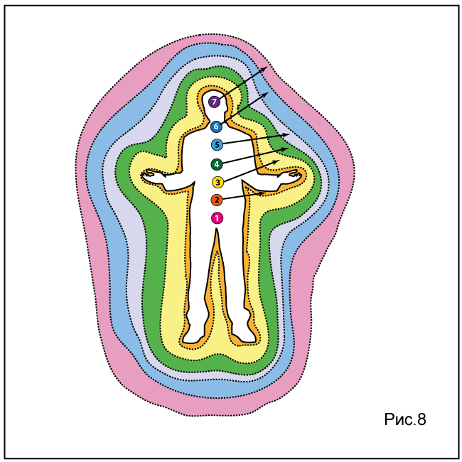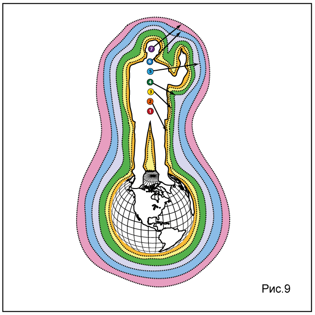 На рис.8 показан образ земного Человека, сына или дочери – микро копии Бога – Мироздания. Человек состоит, подобно Богу – Мирозданию, из семи сферических тел. Первое тело видимое, физическое и шесть невидимых, тонких тел: эфирное, астральное, ментальное, каузальное, будхическое и атмическое.